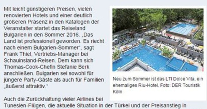С изгодни цени, много ремонтирани хотели и осезаемо по-голямо представяне в туристическите каталози България ще започне силно летния сезон на 2016 г., отбелязва германският седмичен вестник Touristik Aktuell.