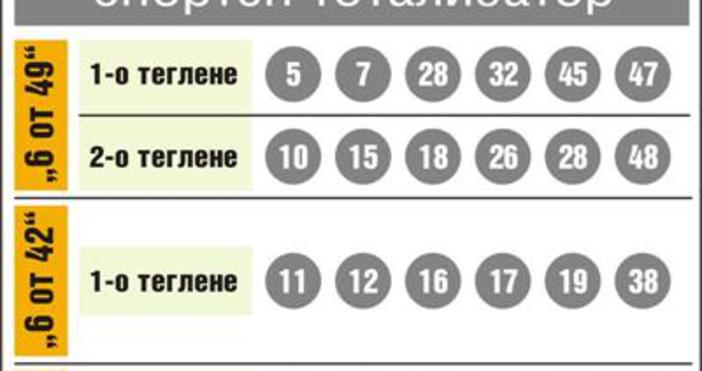 За играта 6/42 очакваната сума ще е 68 000 лева, след като и днес нямаше позната шестица, а късметлийската комбинация за играта 6/42 беше 11, 12, 16, 17, 19, 38. В днешния тираж печелившата комбинация в първо теглене на играта 5/35 беше 16, 18, 24, 28, 31, а във второ теглене късметът определи числата 17, 27, 30, 32, 35. В играта Тото Джокер бяха изтеглени позициите 6, 9, 1, а печелившите цифри бяха 8, 5, 2.
