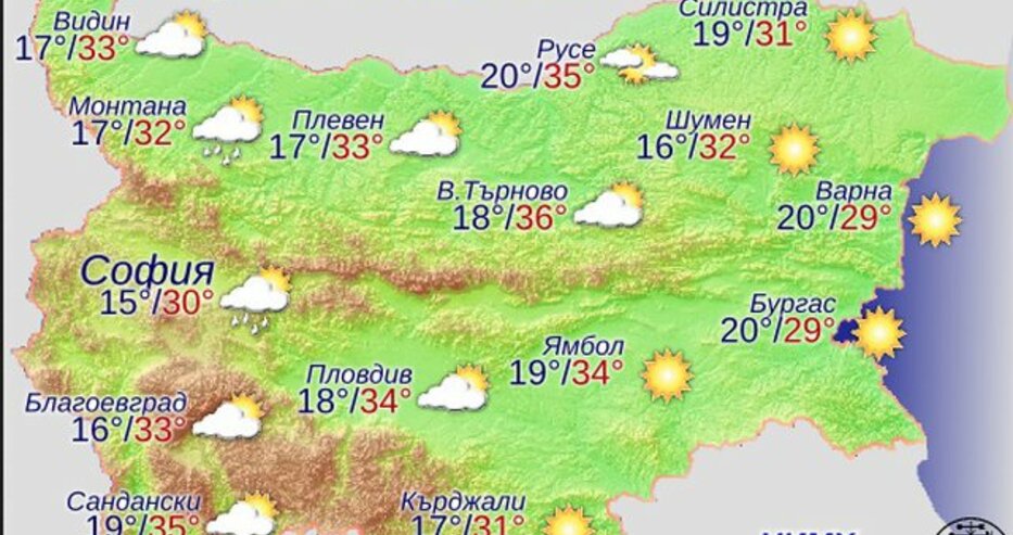 През нощта ще бъде ясно и почти тихо. Утре преди обяд ще бъде слънчево. След обяд над западната половина от страната ще се развива купеста и купесто-дъждовна облачност и на места в планинските райони там ще превали краткотраен дъжд. Ще духа слаб, в Източна България - умерен вятър от изток-североизток. Максималните температури ще са предимно между 30° и 35°.