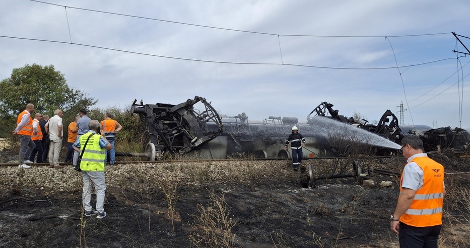 Огнеборците обливат изгорелите цистерни, а по-късно ще започне и тяхното изтегляне, както и на самата композиция.