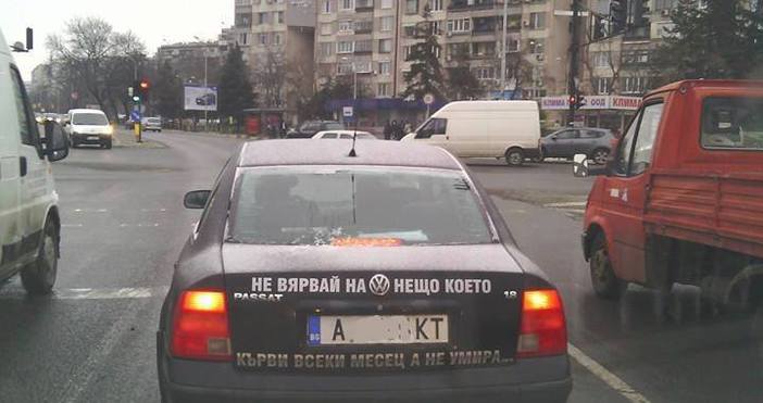 Да слагаш стикери на личния си автомобил може и да не е забранено, но все пак е добре да има някаква мярка. Този "Фолксваген" с бургаска регистрация определено бие на очи с надписа си. Оставаме на вас да прецените доколко тази сентенция е адекватна. Ако желаете споделете мнението си в коментар.