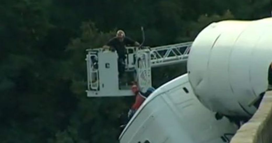 Водачът на цистерната от магистрала "Хемус" е изваден от колата, след като вися на коланите си над 128-метрова пропаст. Без видими наранявания е и е контактен. В момента човекът е в линейка с лекарски екипи.