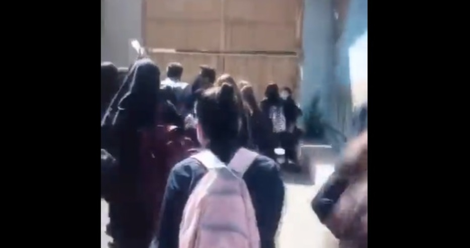 Видеоклипове, чиято автентичност е потвърдена от Би Би Си, показват, че студенти в униформи, които размахват хиджабите си във въздуха и отправят лозунги срещу религиозните власти.