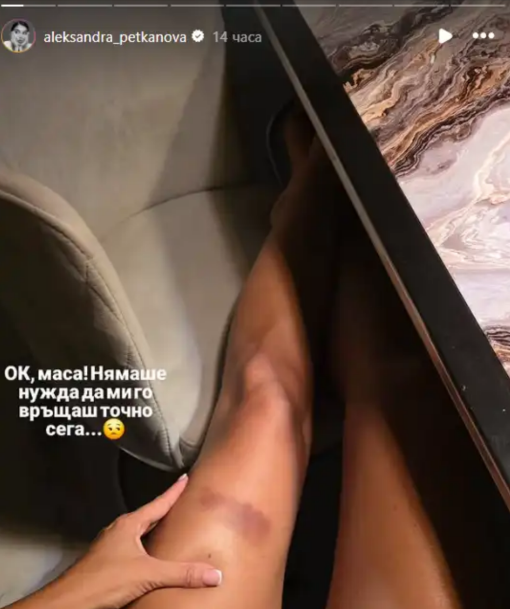Моделката, която инфлуенсърства активно в последните години, показа посинения си крак на стори в Инстаграм и поясни, че става дума за комичен инцидент у дома, пише Блиц.