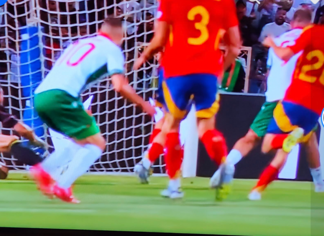 В 16-ата минута Ламин Ямал отново направи "магия" отдясно и подаде пред вратата на Вуцов. Последва изстрел на Педри, но топката излезе в аут. Отговорът на България дойде в 20-ата минута, когато Радослав Кирилов скри топката покрай Педро Поро и шутира към далечния ъгъл, последва намеса на Унай Симон, след което топката се отклони в левия страничен стълб на испанската рамка. След 120 секунди Ламин Ямал се откъсна срещу Светльо Вуцов отдясно и от границата на вратарското поле стреля, но българският страж изби в корнер.