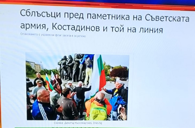 Цитирам: на място се появи и лидерът на Възраждане Костадин Костадинов, който е против опаковането на паметника с украински флаг.