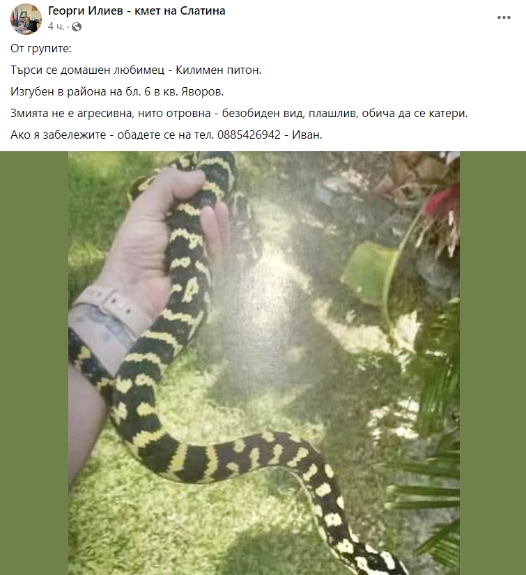 Килимният питон е изгубен в района на бл. 6 в кв. Яворов.