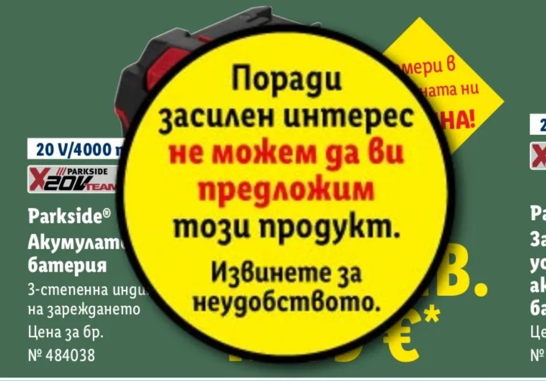 "Вчера след работата минах през Лидл, да си купя една батерия, за да имам на вилата и да не мисля дали си возя в багажника. Продавачката ми казва, че са им донесли само няколко и за половин час са ги продали (това е първи ден от промоцията). Но да съм минел утре (което е днес), обикновено получавали стока всеки ден. Отивам днес в друг магазин и служителката която питам дали имат, ме кара да и я покажа в приложението. Отварям приложението там "задраскана". Питам днес дали са получавали, а тя ми каза, че само вчера са имали малко бройки, но са свършили бързо..."