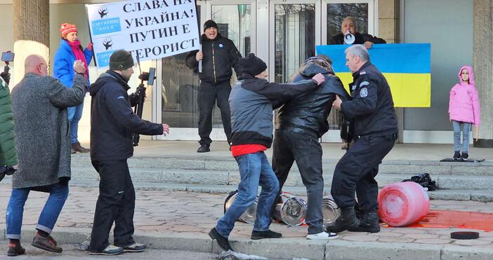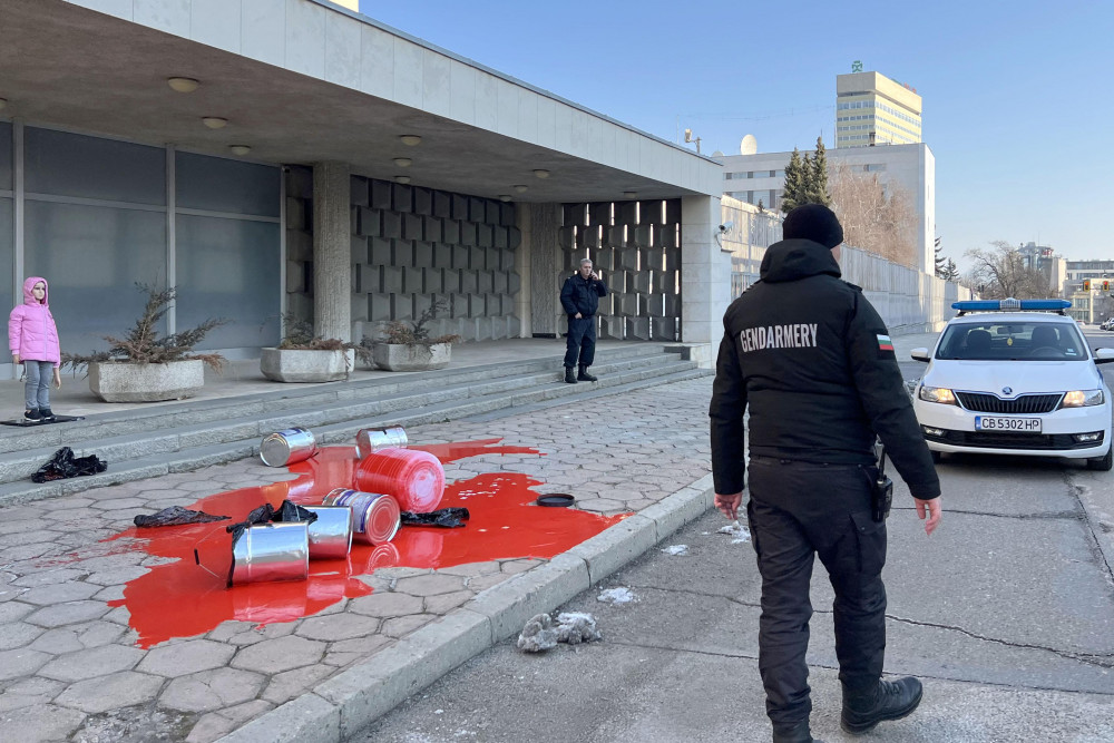 Фотографът-художник Рафаело Казаков и БОЕЦ изляха десетки литри червена боя пред руското консулство в София в акция на протест за годишнината от началото на войната в Украйна.