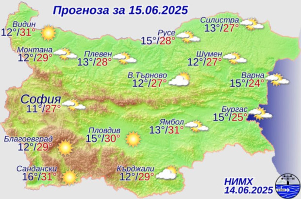 През нощта над по-голямата част от страната времето ще бъде ясно и тихо. Временни увеличения на облачността ще има над централните и източните райони. Утре ще бъде предимно слънчево, след обяд с развитие на купеста облачност, но вероятността за валежи е много малка. Ще духа слаб вятър от север-североизток. Максималните температури ще бъдат между 26° и 31°, в София - около 27°, информират от НИМХ.
