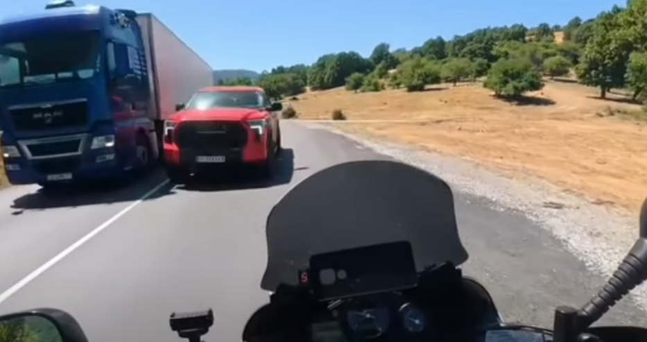 На кадрите се вижда как джип с характерен регистрационен номер прави непозволено изпреварване на ТИР в остър завой и навлиза в насрещното платно. Там се движи мотористът Ангелов, който буквално на косъм избягва удара.