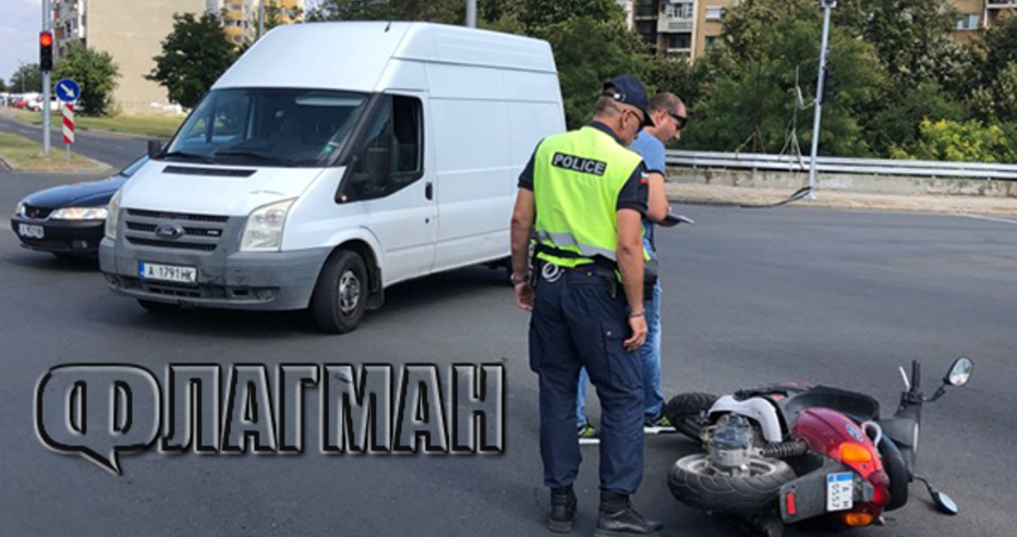 Тежък сблъсък между моторис и микробус прати млад бургазлия в Спешното отделение на УМБАЛ-Бургас, съобщава Флагман.бг Катастрофата е станал преди броени минути, като за момента основна версия за причината е, че товарният автомобил, при ляв завой към булеварда, е отнел предимството на лекия мотоциклет.