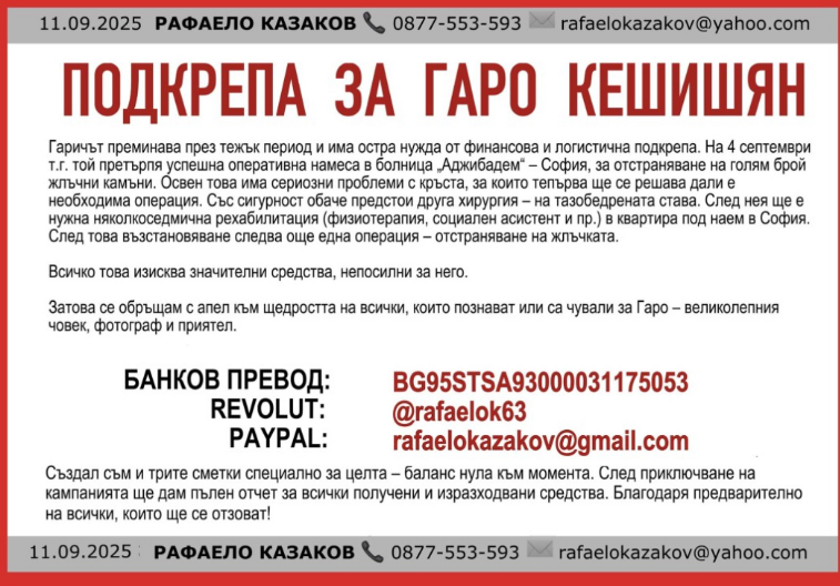 Известният варненски фотограф Гаро Кешишян има спешна нужда от финансова и логистична помощ заради сериозен здравословен проблем.