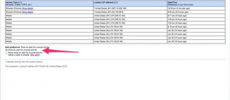 4. Ако някой друг се опитва да отвори вашия Gmail, тази част от услугата ще ви помогне бързо да разберете. За целта трябва просто да кликнете опцията Show alert for unusual activity (Да се показва сигнал при необичайна дейност). Ако забележите подозрителни IPадреси, бързо трябва да промените паролата на пощите си.