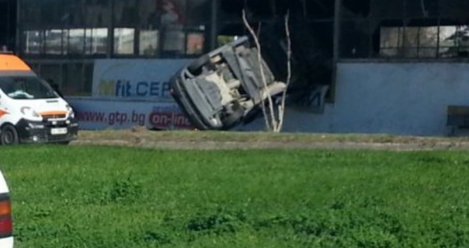 Двете превозни средства са се засекли, бусът полетял и се забил в намиращ се на близо автосервиз.