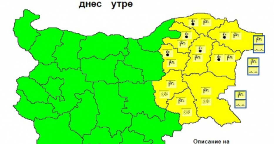 Жълт код за силен вятър и ниски температури е обявен за 6 области в страната. В областите Силистра, Добрич, Разград, Шумен Варна и Търговище ще духа силен северен вятър, който в комбинация с отрицателните дневни температури ще създава усещане за много студено време. Ще има превалявания от сняг и условия за виелици.