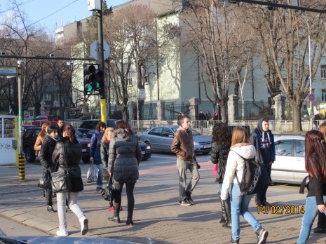 На светофара до Икономическия университет пешеходците, пресичащи успоредно на бул. „Цар Освободител“, правят невъзможен десния завой за автомобили, идващи откъм х-л „Орбита“.