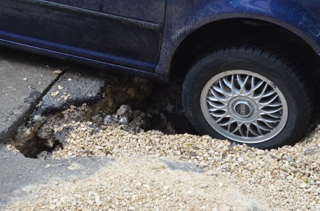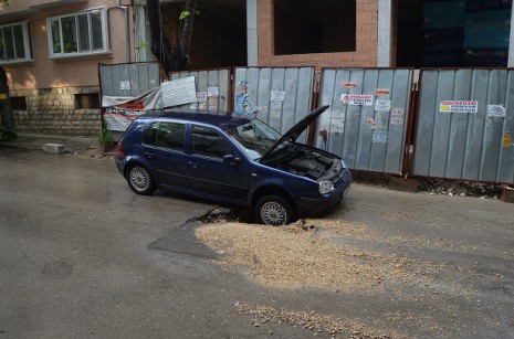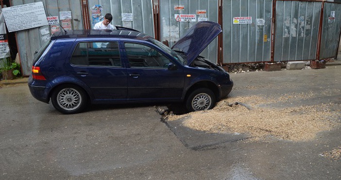 Кола марка „Фолксваген“ заседна в дупка на ул. „27 юли“. Трапът, който е в съседство със строеж, е пълен с чакъл. Наскоро мястото беше разкопано, очевидно за свързване на строящата се сграда с ВиК – мрежата. След това дупката беше запълнена с чакъл, но така и не дочака възстановяване на асфалта. Хлътването на автомобила обаче показва, че вероятно долният пласт на улицата не е устойчив. При пропадането на „Фолксваген“-а няма пострадали хора, а какви са щетите на колата засега е трудно да се каже. Ироничното в случая е, че автомобилът се е движил в нарушение, срещу посоката за движение по еднопосочната улица.