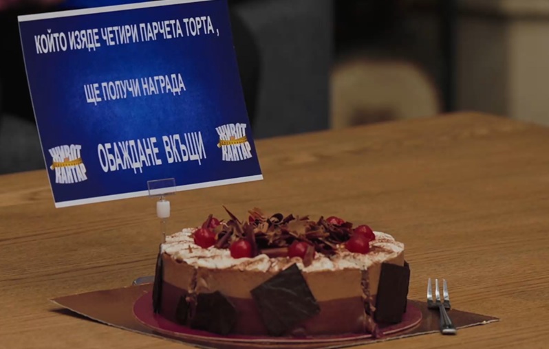 Ужасяващо изтезание измислиха сценаристите за участниците в шоуто "Живот на кантар". След като дълго време състезателите, които се борят с килограмите си, не са виждали и чували семействата си, пред тях бе поставено изкушението да разговарят с тях по телефона. Но на каква цена? До телефон на масата в хола си участниците откриха торта, разделена на четири равни части. Който изяде и четирите парчета, може да поговори с най-любимите си хора.