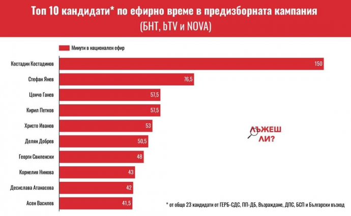 Костадинов е лидер по време в телевизионен ефир от всички политици в България по време на предизборната кампания: