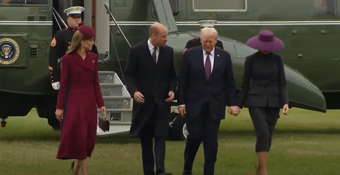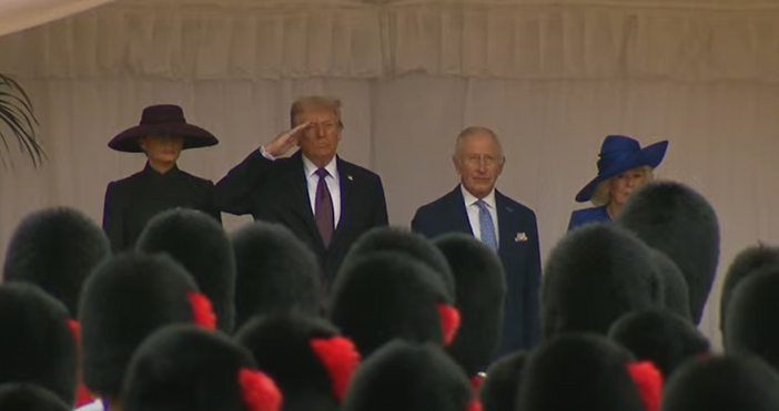Принц Уилям и съпругата му Кейт посрещнаха президента и първата дама Мелания Тръмп, след което бяха посрещнати и от крал Чарлз и кралица Камила.