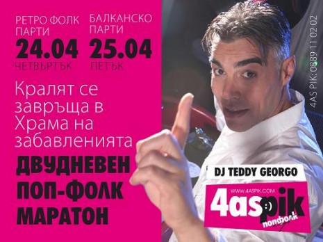 Двудневен поп-фолк маратон ще зарадва всички, които отдавна чакат точно това събитие в Час Пик. Радостта на поп-фолк феновете ще е двойна, защото кралят на диджеите Теди Джорджо се завръща в храма на забавленията с две партита.