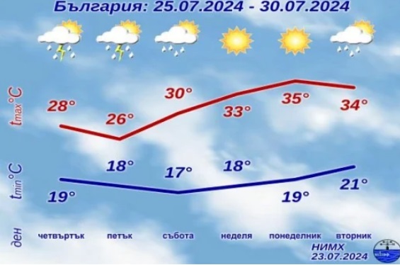 Максималните температури ще са предимно между 30° и 35°, в София - около 30°.
