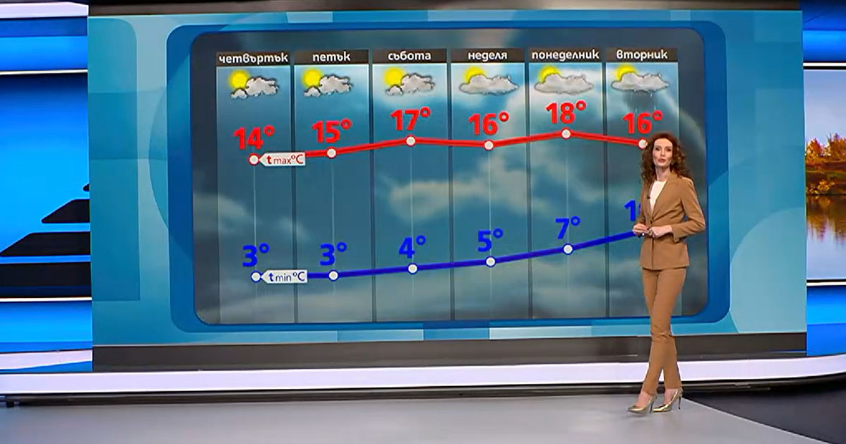 Дневните стойности обаче ще се повишават като в събота очакваме до 15 - 20 градуса. В края на тази и началото на следващата седмица ще има малко повече облаци но все още ще бъде без валежи. Показанията на термометрите ще останат сравнително високи. Във вторник, със усилване на вятъра и валежи, през страната ще премине студен атмосферен фронт. С него ще настъпи и захлаждане, обясни Малкоданска.