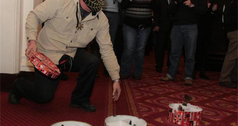 Неизвестен човек с маска на Спайдърмен отвори в парламента няколко кутии, от които излязоха пеперуди. Това се случва по време на обедната почивка на парламента, предаде "24 часа".