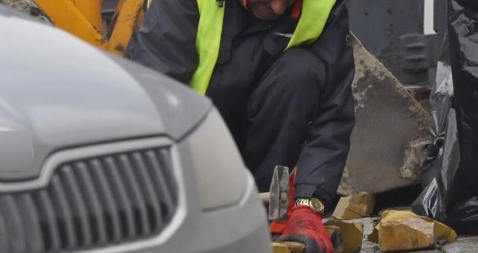 На него се вижда как работник сцепва с чук няколко павета на две, за да ги намести в пътната настилка.