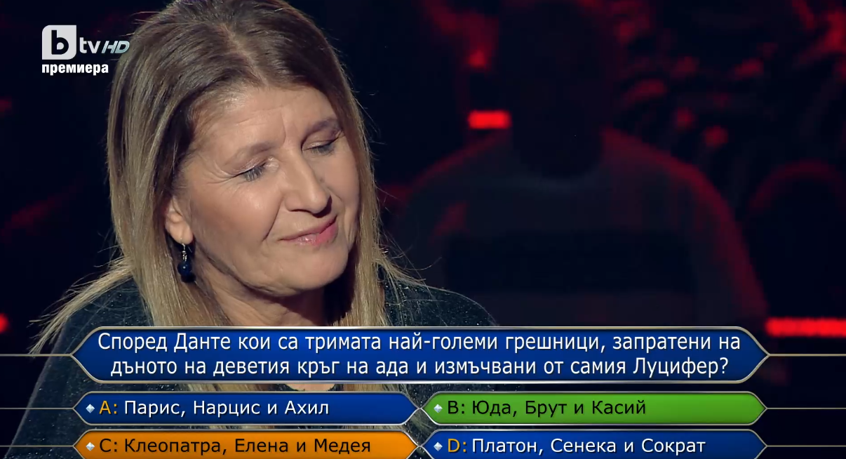 За 10 000 лбева Таня бе попитана: Според Данте кой са тримата най-големите грешници, запратени на дъното на деветия кръг на ада и измъчвани от самия Луцифер? – Парцис, Нарцис и Ахил, Юда, Брут и Касий, Клеопатра, Елена и Медея и Платон, Сенека и Сократ.