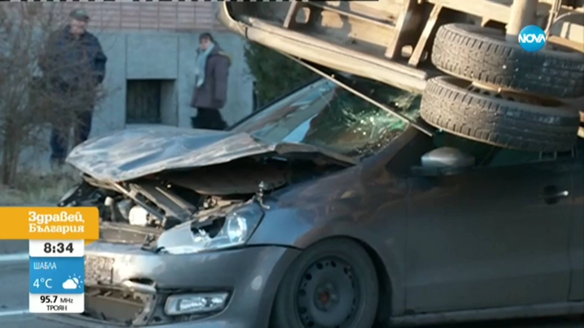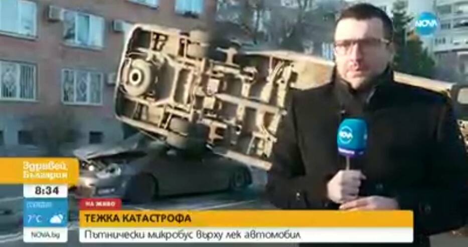 Пътнически микробус се е оказал върху автомобил, показва Нова тв.
