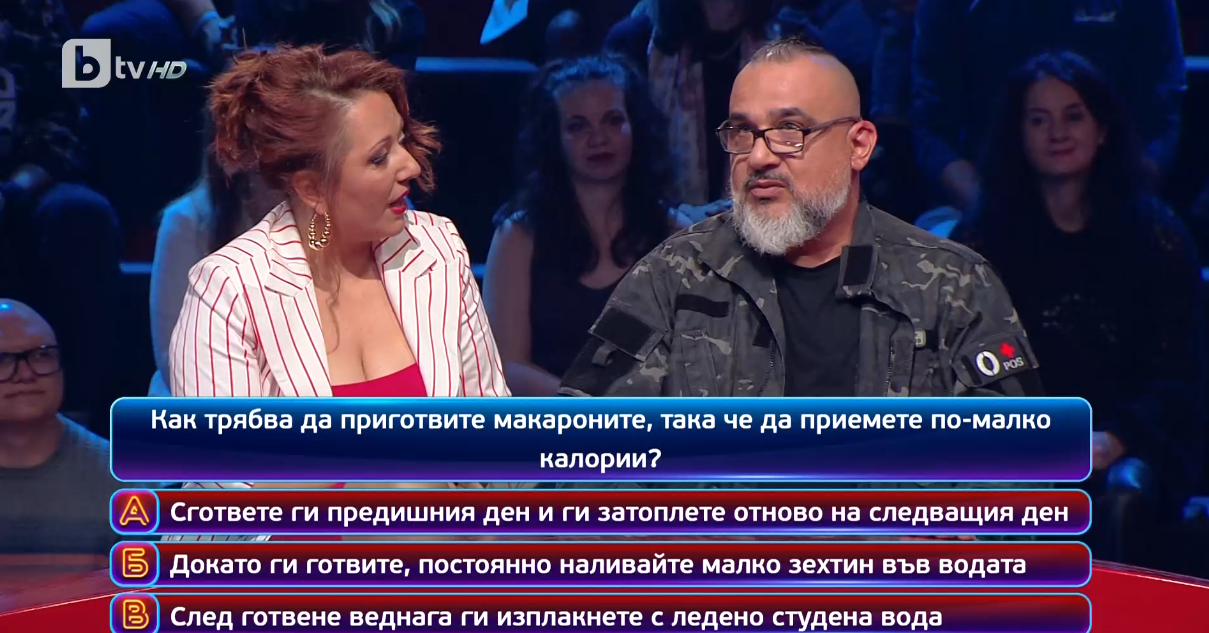 За нейно съжаление обаче двамата се издъниха още на първия въпрос, след като бяха попитани как трябва да се приготвят макарони, така че да се приемат по-малко калории.