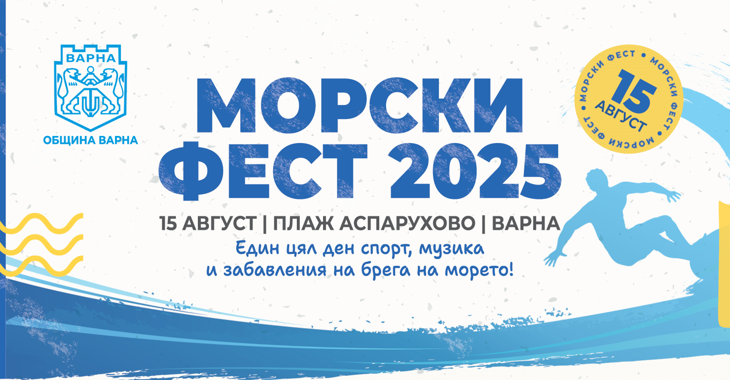 Цял ден на плажа с демонстрации по морски спортове, плажни игри и концерт на открито – това е Морски фест 2025 г. Събитието се организира от дирекция „Спорт“ в Община Варна по повод празника на морската столица – 15 август, Свето Успение Богородично. Той ще се проведе на плажа в кв. „Аспарухово“ и е с вход свободен за всички варненци и гости на града, пише live.varna.bg.