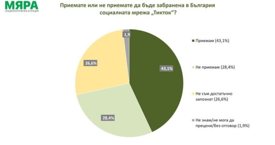 43,1% реагират положително към забрана, 28,4% са против забрана, а 26,6% признават, че не са достатъчно запознати, за да формират ясна позиция. Към тях могат да се добавят още 1,9%, които не отговарят. Явно мненията засега са по-скоро скептични към „ТикТок“ – вероятно сработва и известен поколенски рефлекс. В същото време запознатостта към темата едва ли е най-високата, дори и при новинарския поток, свързан с Румъния или САЩ. Това прави част от отговорите абстрактни и само последващо проучване би могло да установи детайлите.