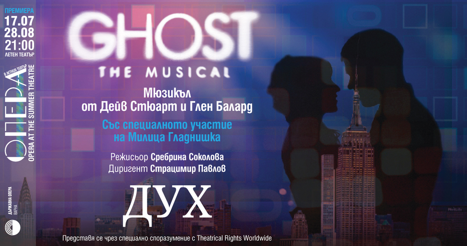 С две премиерни дати, на 17 юли и 28 август, Държавна опера Варна включва най-новия си мюзикъл „Дух“ в програмата на XV Опера в Летния театър. Създаден по любимия на няколко поколения едноименен холивудски филм с Деми Мур, Патрик Суейзи и Упи Голдбърг, мюзикълът прави премиерата си в Манчестър през 2011 г. и веднага след това превзема сцените на Уест Енд и Бродуей. Автор на либретото е Брус Джоел Рубин, а музиката е на Глен Балард и Дейв Стюарт, когото публиката познава като дуетната половинка на Ани Ленъкс от Eurythmics.