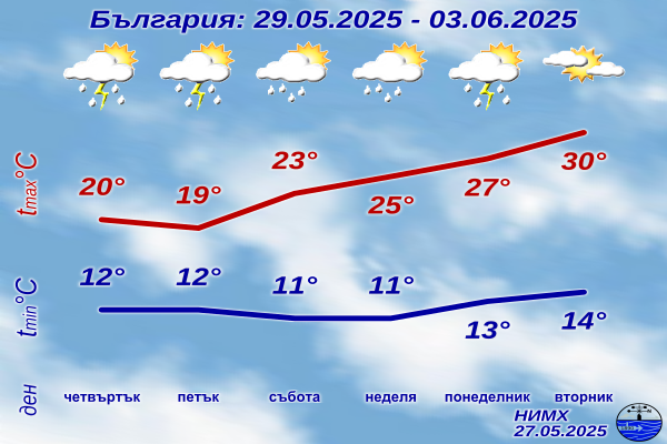 В четвъртък и петък ще се развива купеста и купесто-дъждовна облачност и през първия ден, главно в Западна и Централна, а втория - в Централна и Източна България, ще има следобедни краткотрайни валежи и гръмотевици. В нощните часове на четвъртък срещу петък също ще има явления, които към сутринта в повечето райони временно ще затихват. През деня ще има и слънчеви часове, но и условия за локални интензивни извалявания. Най-малка е вероятността за валежи в западната половина от Дунавската равнина и по Черноморието в четвъртък. Вятърът ще бъде от запад-северозапад, умерен, в Дунавската равнина все още временно силен, в петък вятърът ще отслабне. Ще остане сравнително хладно за края на май с максимални температури около 20°. През почивните дни валежите ще са на по-малко места и по-слаби, ще са главно в планините и в Източна България. Ще преобладава слънчево време. Вятърът ще придобие южна компонента, температурите ще се повишат и преобладаващите максимални в неделя ще бъдат между 23° и 28°. В началото на следващата седмица от юг-югозапад ще се затопли още, но в следобедните часове са възможни локални краткотрайни превалявания и гръмотевици, с по-голяма вероятност в понеделник. Във вторник ще бъде предимно слънчево и в низините с температури, надхвърлящи 30°.
