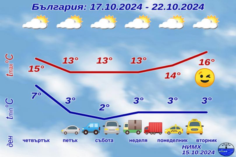 През следващите дни до края на тази и в началото на следващата седмица вятърът ще бъде от изток, слаб, в източните райони - предимно от североизток, до умерен. Понижението на температурите ще продължи и средноденонощните ще станат малко по-ниски от обичайните. Преобладаващите минимални от петък нататък ще са между 0° и 5° и в местата защитени от вятър ще има условия за образуване на слана. Максималните ще са предимно между 11° и 16°. Вероятността за валежи е малка, възможни са само изолирани краткотрайни и незначителни превалявания, главно в крайните източни райони през почивните дни. Ще преобладава слънчево време, с по-значителни временни увеличения на облачността, висока и средна, над Югозападна България. Сутринта на места в източните райони ще има мъгла или ниска облачност и намалена видимост. В края на периода ще започне затопляне.