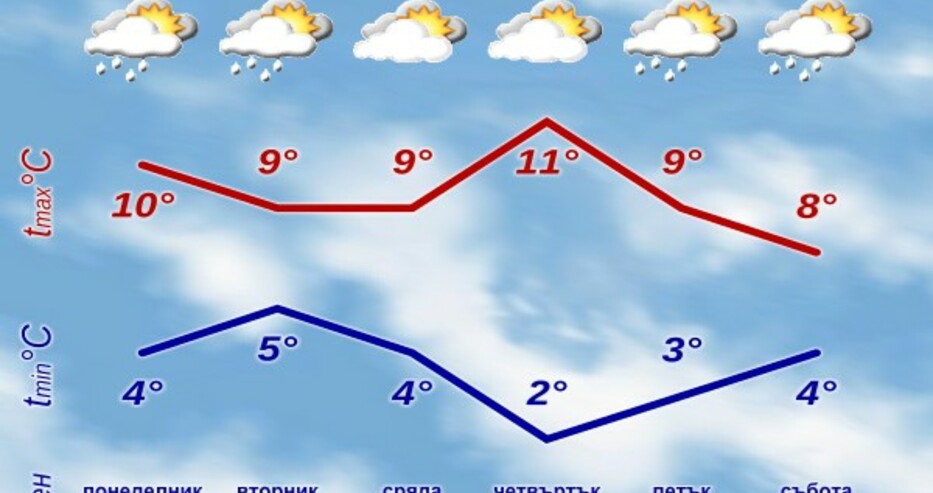 Ще е почти без валежи, ще има и временни разкъсвания и намаления на облачността. В четвъртък, с южен вятър, температурите временно ще се повишат. Облачността ще е по-често значителна, на отделни места е възможно да превали слаб дъжд.