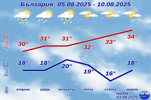 Утре главно над Западна България ще се развива купесто-дъждовна облачност. Ще има краткотрайни валежи, придружени с гръмотевици, като по-интензивни ще са явленията в крайните западни райони и в планините. Има условия и за градушки. Предимно слънчево ще се задържи времето в Централна и Източна България. Вятърът в Западна България ще започне да се ориентира от северозапад, в Дунавската равнина ще е умерен и временно силен. В останалата част от страната ще остане от изток-югоизток, слаб до умерен. Максималните температури ще бъдат от 27°-28° във високите полета в Югозападна България до 34°-35° в югоизточните райони, в София – около 28°. Това съобщават от НИМХ.