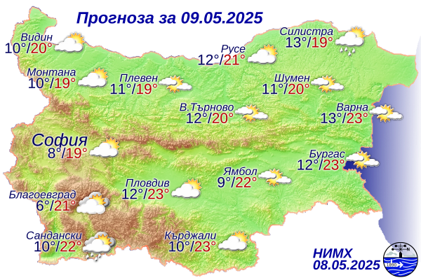 По Черноморието ще бъде предимно слънчево. Ще духа слаб, по северното крайбрежие умерен вятър от запад-северозапад. Максималните температури ще са 21°-23°. Температурата на морската вода е 13°-15°. Вълнението на морето ще бъде 1-2 бала.