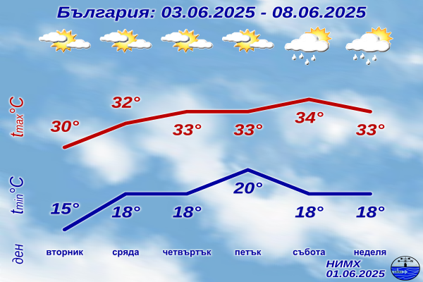 През следващите дни времето ще бъде предимно слънчево, след обяд с развитие на купеста облачност. Вероятността за валежи е малка, все пак не са изключени изолирани краткотрайни превалявания, главно в планинските райони. Вятърът ще е слаб с южна компонента, временно ще стихва. Температурите ще се повишат още и в четвъртък и петък максималните ще бъдат между 31° и 36°. В събота и неделя в по-голямата част от страната времето ще се задържи слънчево, но се повишава вероятността в часовете около и след обяд да се развие по-значителна купеста и купесто-дъждовна облачност и да има краткотрайни валежи, придружени с гръмотевици на места, главно в Западна България и планините. Температурите ще останат сравнително високи, максималните - над 30°.
