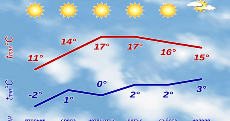 През следващите дни от новата седмица предстои бързо и чувствително затопляне. Времето ще бъде слънчево, сутрин на места в низините и котловините с условия за намалена видимост. Във вторник и сряда в източната половина от страната ще духа слаб вятър със северна компонента, в западната ще е почти тихо. Минималните температури ще се понижат с 3-4 градуса, а дневните ще се повишават и в сряда максималните ще са между 12° и 17°. През следващите три дни ще има временни увеличения на облачността, предимно висока. В четвъртък в Северна България ще духа слаб до умерен северозападен вятър, в петък ще отслабне и ще се смени с изток-югоизточен, към неделя в повечето райони и ще стихне. Затоплянето ще продължи и в четвъртък и петък дневните температури в много райони ще се доближават, на места и достигат до 20°; през почивните дни съвсем слабо ще се понижат.