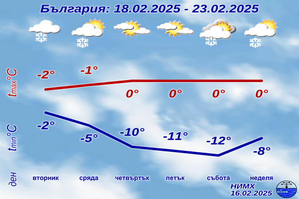 Повишава се и вероятността за слаби валежи от сняг, в събота - в Западна България, а в неделя - в планинските райони в Южна. Сутрешните температури ще се понижат значително и най-ниски ще са в петък и събота, в по-голямата част от страната минималните ще са между минус 14° и минус 9°, а максималните до края на седмицата ще са близки до 0°.
