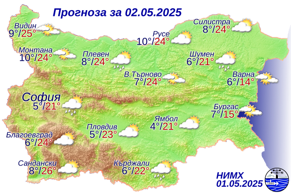 Минималните температури ще са главно между 5° и 10°, в София - около 5°. Утре ще бъде предимно слънчево. След обяд ще се развива купеста облачност и на места, отново главно в планинските райони на Западна и Централна България ще превали краткотраен дъжд, в отделни райони и ще прегърми. Ще духа слаб, в Източна България - умерен вятър от изток-североизток. Максималните температури ще са между 21° и 26°, в София - около 21°.