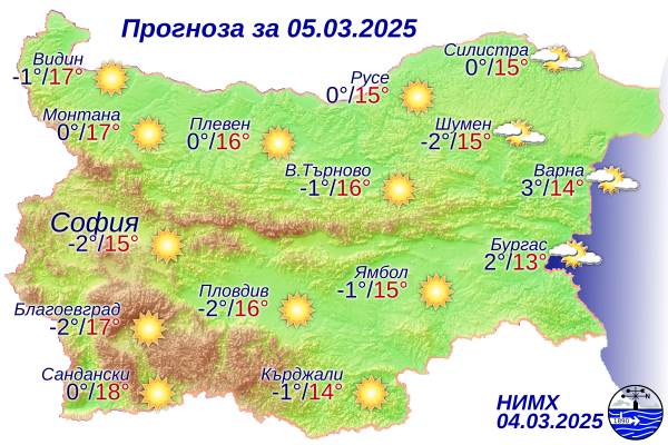 През нощта ще бъде ясно със слаб вятър от юг-югозапад. В сутрешните часове на места в равнините, котловините и около водните басейни ще има ниска слоеста облачност или мъгла. Минималните температури ще бъдат между минус 4° и 1°, в София – около минус 2°. Утре ще бъде слънчево. Ще духа слаб вятър, предимно от северозапад. Максималните температури ще бъдат между 13° и 18°, в София – около 15°.