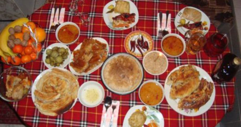 Празничната трапеза се нарежда върху слама на земята в югоизточния ъгъл на одаята под иконостаса. На трапезата трябва да има 7, 9 или 12 ястия. Това са три от свещените числа на древноюдейската Кабала. Гозбите обаче са постни. Трапезата трябва да е отрупана с всички, което се произвежда в домакинството: варено жито, варен фасул, сърми, пълнени чушки с боб (или ориз), ошаф, туршии, лук, чесън, мед и орехи, вино. В някои краища правят също тиквеник, зелник и малка пита, в която е скрита паричка (на когото се падне, ще бъде щастлив цялата година). В четирите ъгъла на стаята се поставя по един орех. Това се прави, за да се осветят четирите краища на света.
