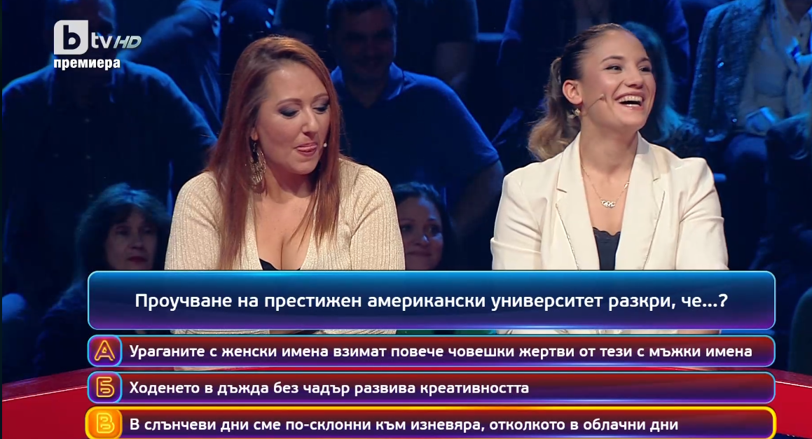 Драма с олимпийска и вицеолимпийска шампионка при въпрос в шоу. Сребърното ни момиче от Игрите в Париж Боряна Калейн и капитана в отбора й Христо Пъдев бяха попитани от Сашо Кадиев: Проучване на престижен американски университет разкри, че...?, с опции: А – Ураганите с женски имена взимат повече човешки жертви от тези с мъжки имена, Б – Ходенето без чадър в дъжда развива креативността, В – В слънчеви дни сме по-склонни към изневяра, отколкото в облачни дни.