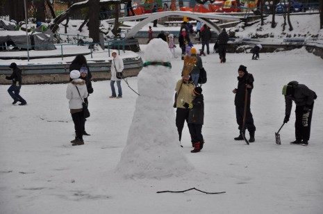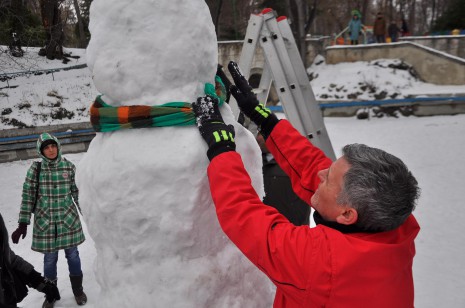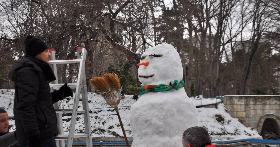 Най-големият снежен човек в Морската градина стърчи в езерото на Детския кът