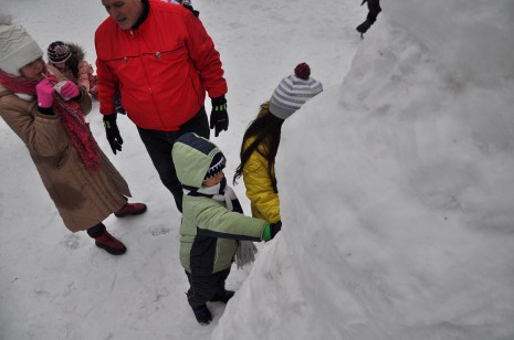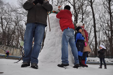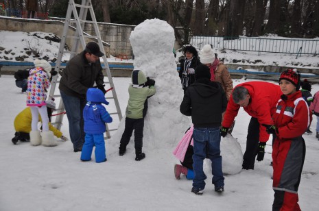Първо мъжете направиха една голяма снежна топка и когато вече не можеха да я търкалят я застопориха в центъра на езерото. Тогава дойде ред и на още една по-малка, която татковците качиха върху първата. За изработката на главата се наложи да се използва стълба. Никой не падна от нея, защото мнозина я държаха в основата й. Така бяха поставени ръце от клон и метла, нос от морков и очи от клони.